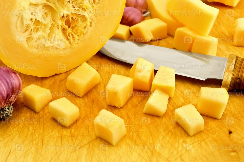Разрезанный желтый кабачок, чеснок и нож на деревянной доске
