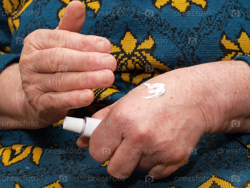 Пожилая женщина намазывает на руку крем