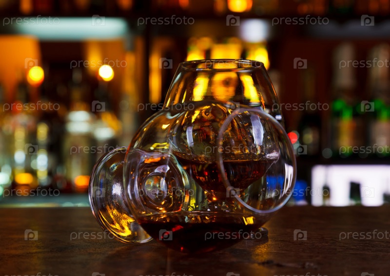 Два бокала коньяка на темном деревянном столе