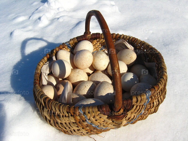 Корзина с яйцами индейки на снегу