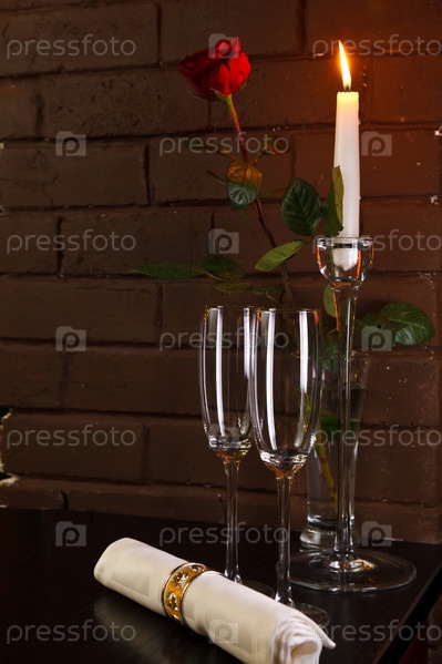 Праздничный натюрморт со свечой, бокалами для вина и розой