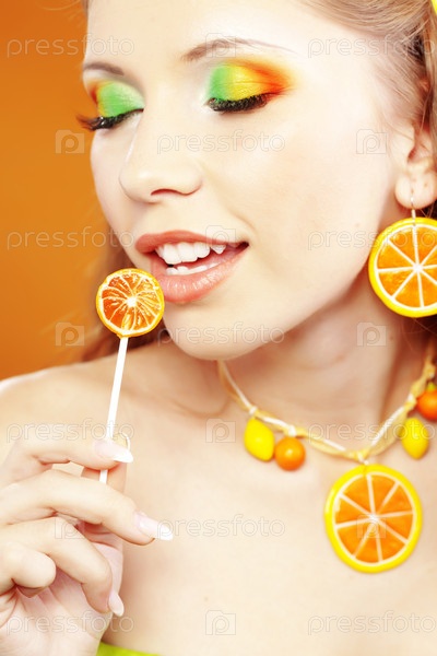 Стильная девушка с ярким макияжем в оранжевых тонах в студии