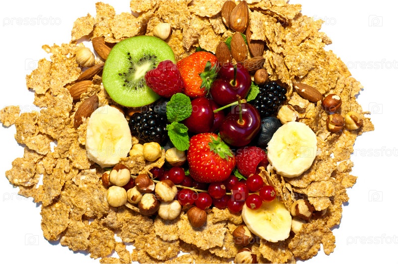 Разные фрукты, ягоды, орехи и зерновые хлопья