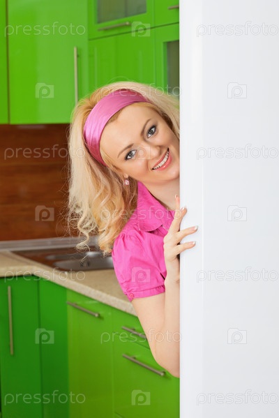 Молодая домохозяйка на кухне рядом с холодильником