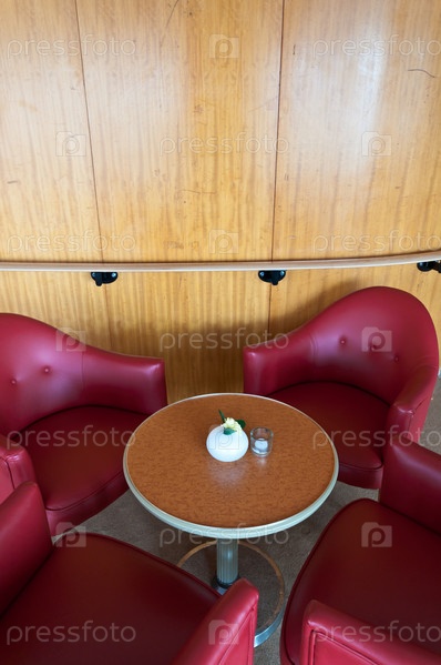 Кожаные кресла и деревянные столы в ресторане