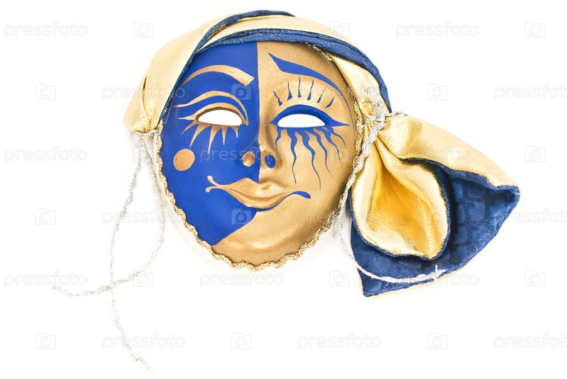 Синяя карнавальная маска крупным планом на белом фоне