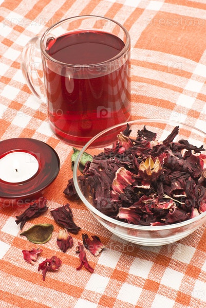 Чай из шиповника, свеча и сухие лепестки в стеклянной миске