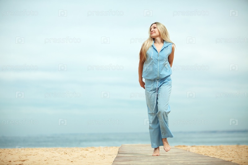 Женщина среднего возраста отдыхает на пляже у моря