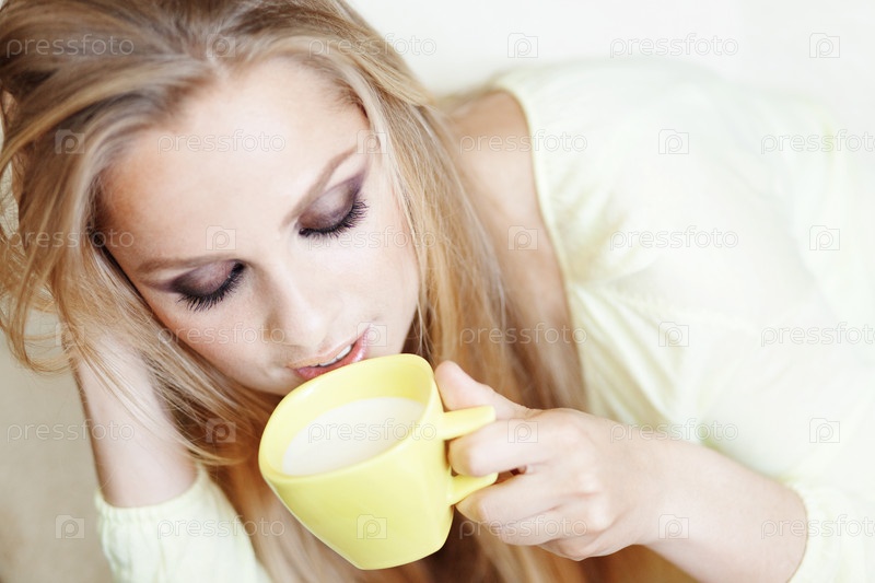 Светлый портрет красивой женщины с чашкой чая на диване