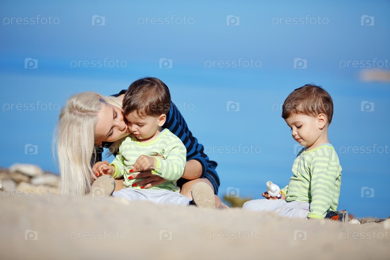 Счастливая семья отдыхает на пляже летом