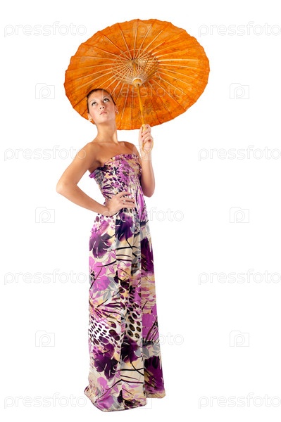 Молодая красивая женщина с азиатским зонтиком, изолированная на белом фоне
