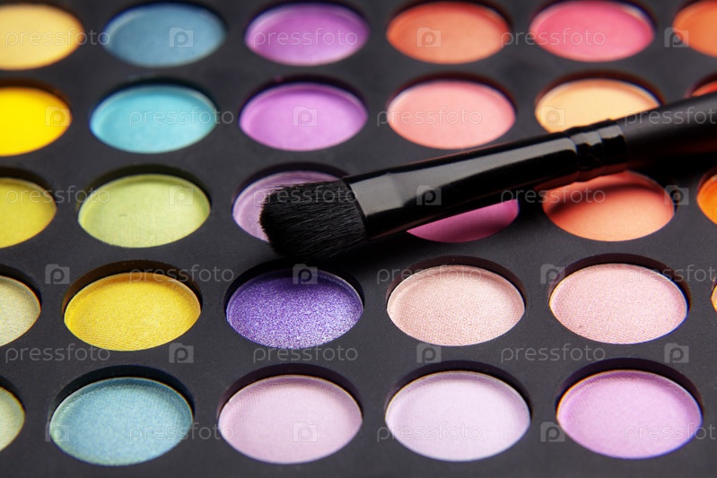 Красочная палитра для макияжа глаз и кисть крупным планом