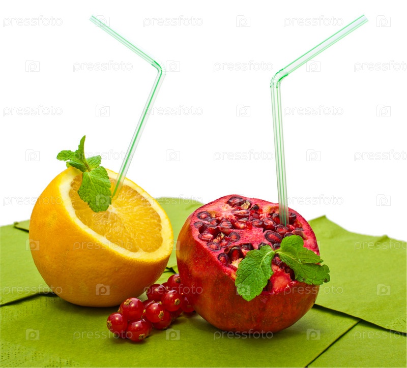 Апельсин и гранат с соломинками на белом фоне