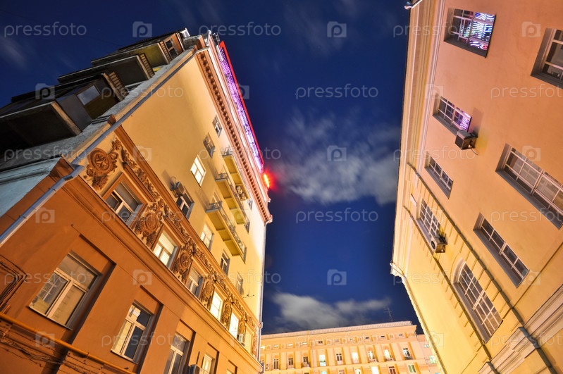 Два старых здания на фоне облачного ночного неба
