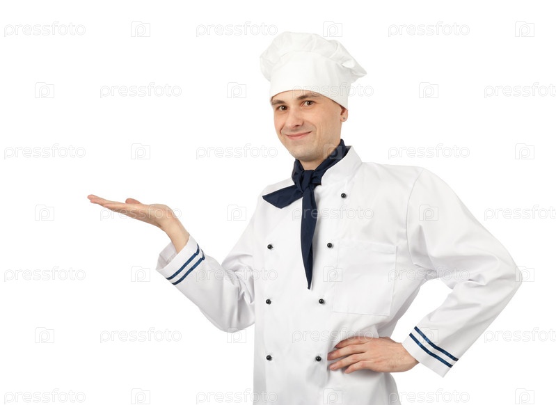 Шеф-повар с пустой ладонью, изолированный на белом фоне