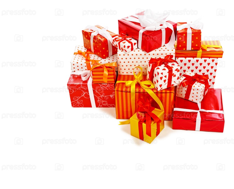 Куча праздничных подарков с атласными лентами, изолированных на белом фоне