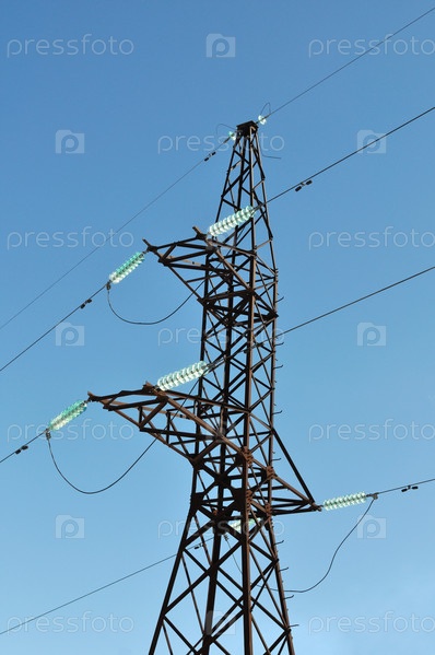 Мачта высоковольтного электрического канала на фоне синего неба