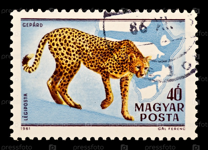 Почтовая марка с изображением гепарда. изолированная на черном фоне