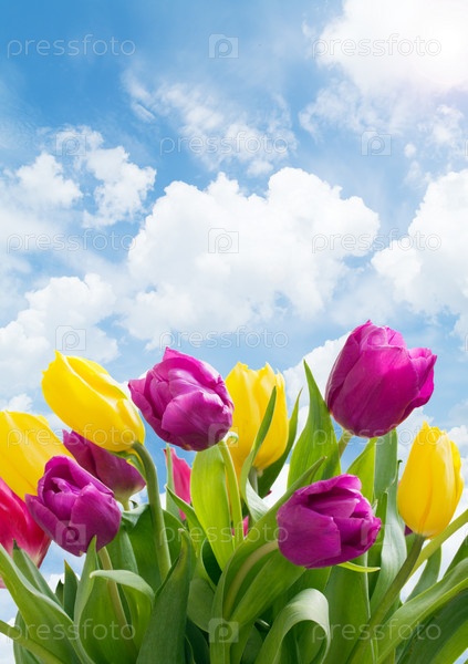Растущие желтые и фиолетовые тюльпаны на фоне облачного неба
