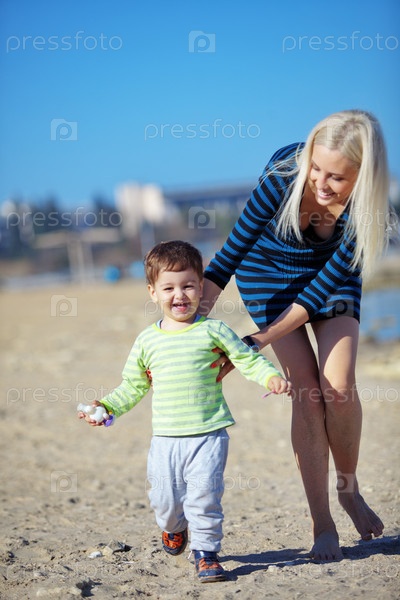 Молодая мать с ребенком отдыхает на пляже