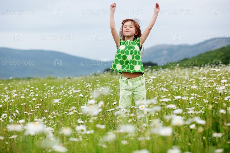 Хорошенькая девочка на ромашковом поле