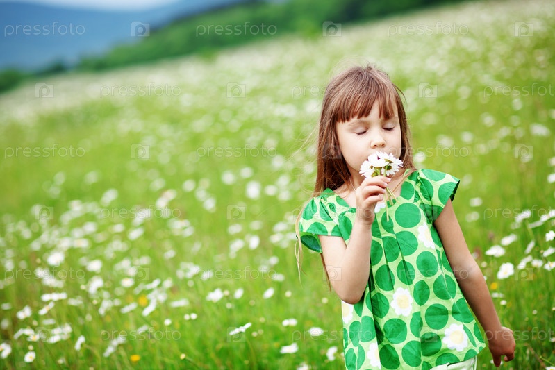 Хорошенькая девочка на ромашковом поле
