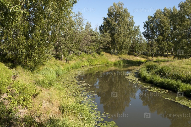 Тихая река с водяными лилиями в летнее время