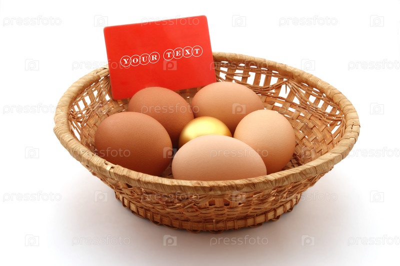 Корзина с обычными куриными яйцами и золотым яйцом на белом фоне