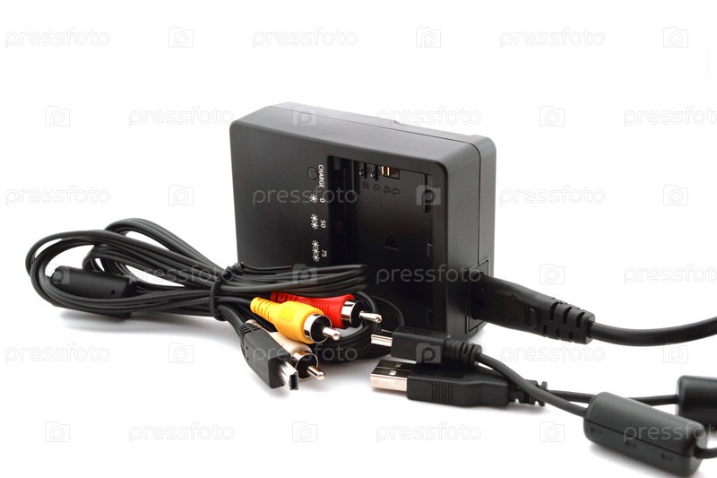 Зарядное устройство для аккумулятора и соединительные кабели на белом фоне