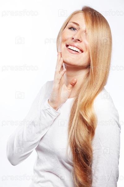 Студийный портрет красивой молодой женщины с длинными золотыми волосами