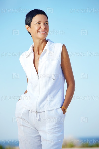 Женщина среднего возраста отдыхает на пляже
