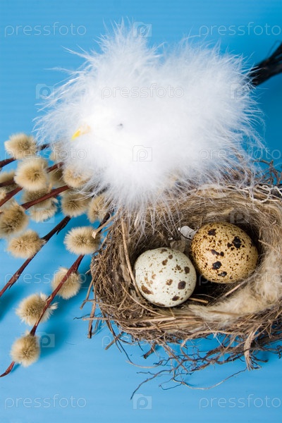 Пасхальный натюрморт с перепелиными яйцами в гнезде на синем фоне