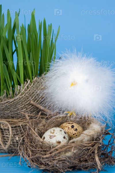 Пасхальный натюрморт с перепелиными яйцами на синем фоне