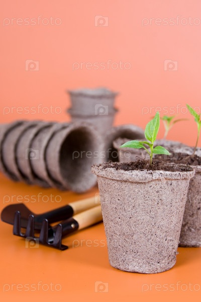 Торфяные горшки и садовый инструмент на оранжевом фоне