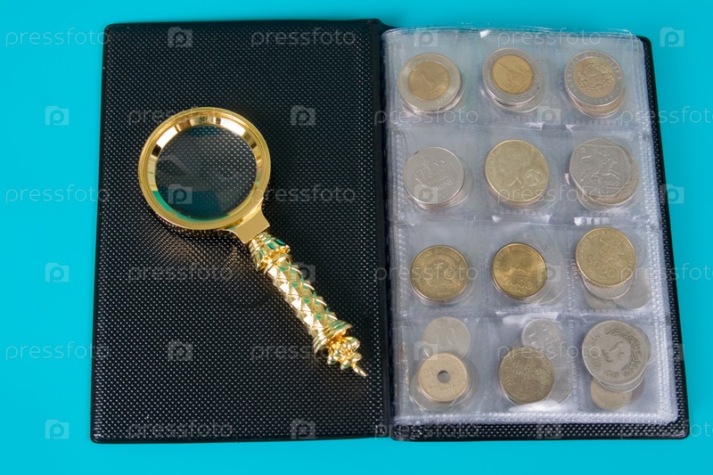 Увеличительное стекло и альбом с коллекцией монет на синем фоне крупным планом