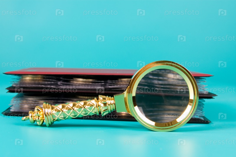 Увеличительное стекло и альбом с коллекцией монет на синем фоне крупным планом