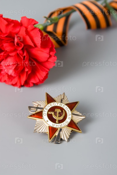 Орден Отечественной войны и лента Святого Георгия на сером фоне