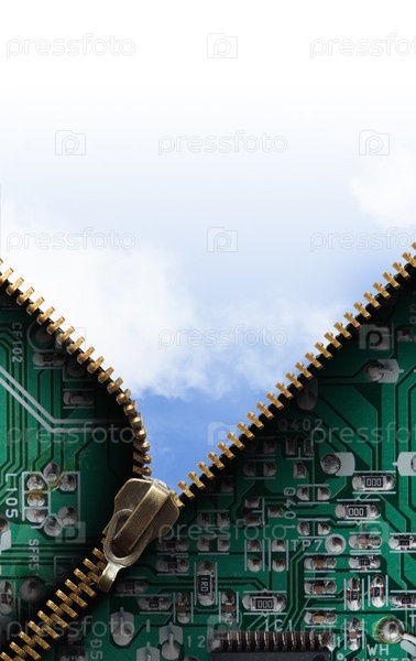 Понятие экологии. Расстегнутая металлическая молния на материнской плате на фоне голубого неба