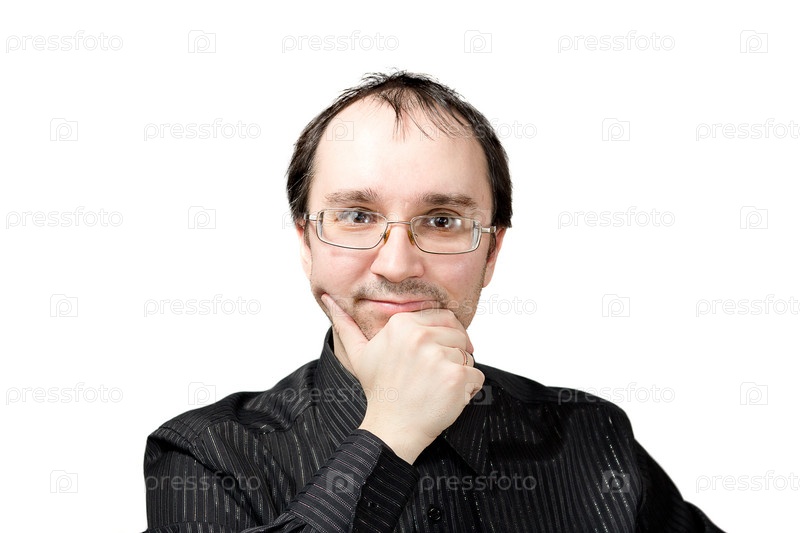 Солидный успешный мужчина в черной рубашке, изолированный на белом фоне