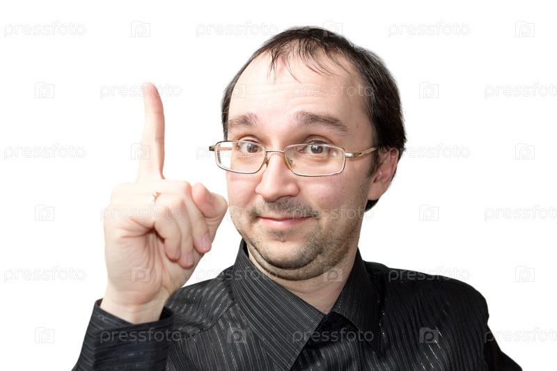Мужчина твердым жестом указывает вверх и обращает внимание, изолированный на белом фоне