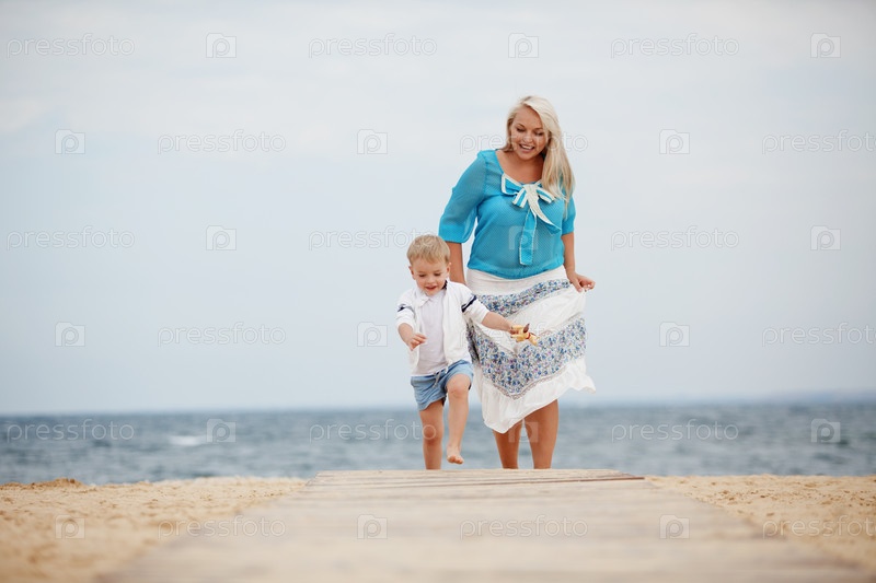 Счастливая семья отдыхает на пляже летом