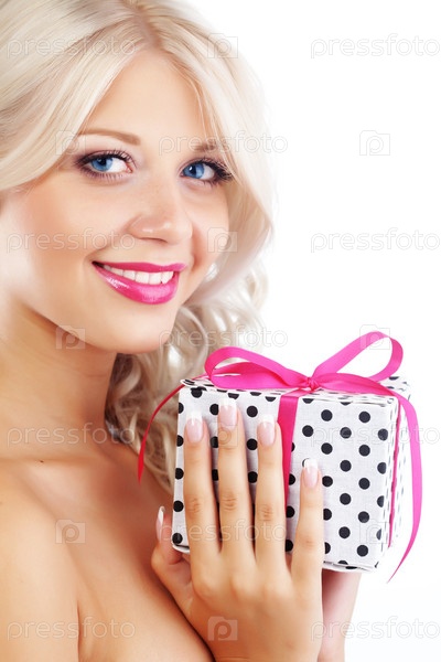 Портрет милой молодой женщины с завернутым подарком