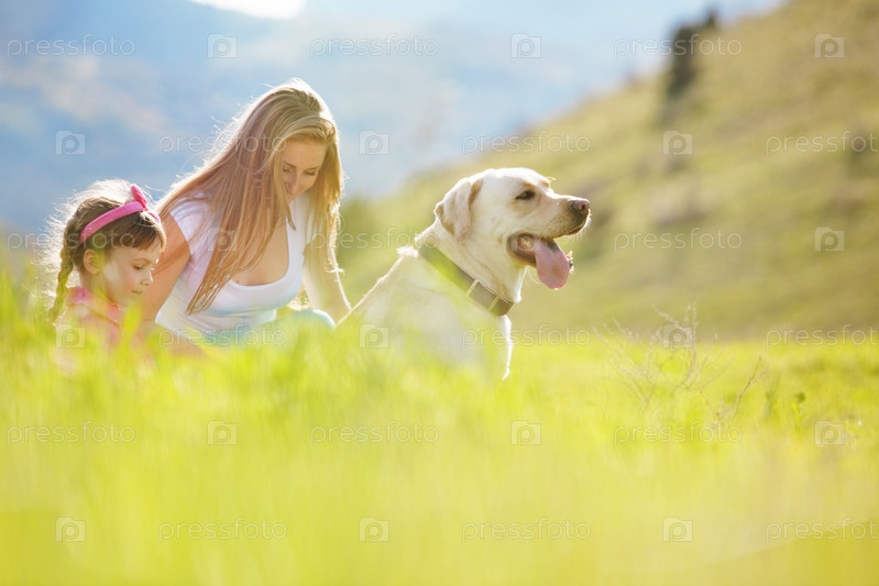 Счастливая семья гуляет с собакой на зеленом поле