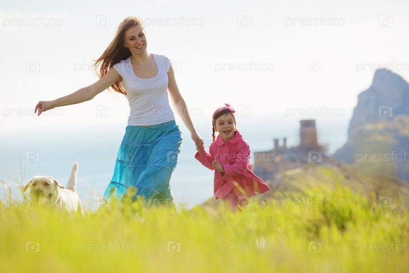 Счастливая семья гуляет с собакой на зеленом поле