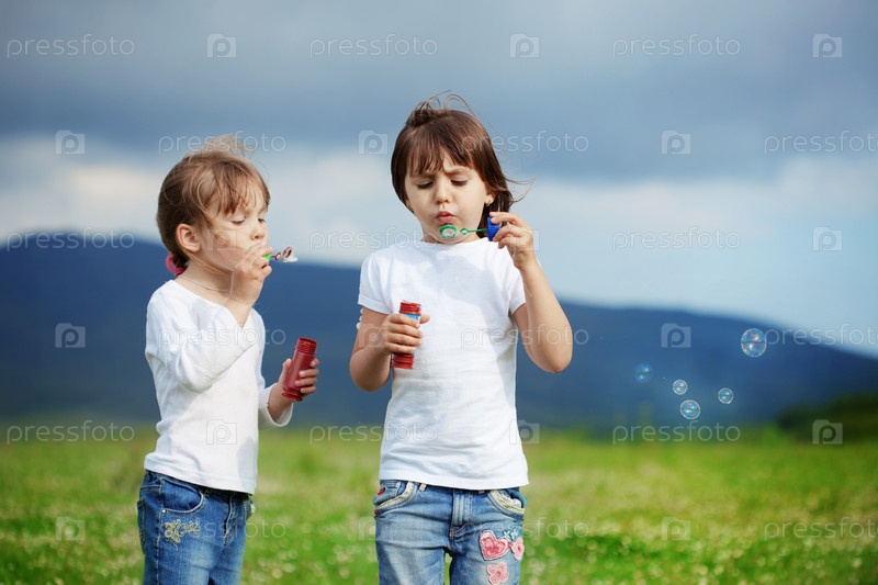 Счастливые девочки пускают мыльные пузыри на зеленом поле