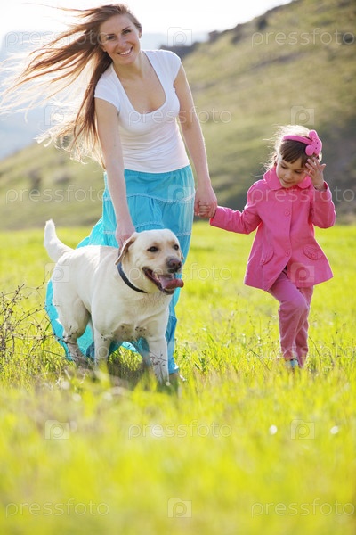 Счастливая семья гуляет с собакой на зеленом поле