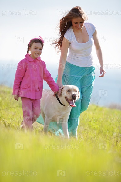 Счастливая семья гуляет с собакой на зеленом поле