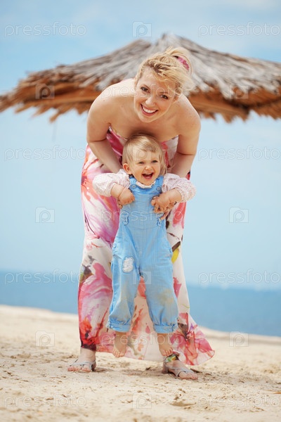 Счастливая семья отдыхает на пляже летом