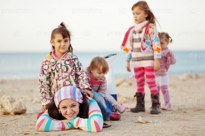 Счастливая семья отдыхает на пляже летом