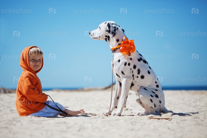 Счастливый ребенок с собакой на пляже
